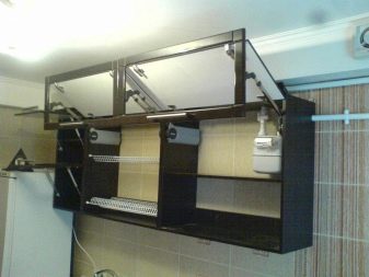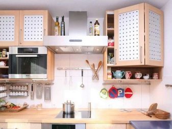 Els armaris superiors es poden fixar a la paret, on no hi ha armaris de sòl i superfície de treball. Amb aquesta opció, es guien per l'ergonomia i el disseny de tots els auriculars. El mateix enfocament s’utilitza quan s’instal·la mobles sobre electrodomèstics (microones, forns, refrigeradors, etc.).
