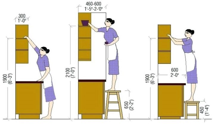 La distància entre les prestatgeries de l’armari pot ser de 20 o 30 centímetres. Tot i que els estàndards existents estableixen l’altura màxima de muntatge de l’element superior a 190 centímetres, però aquest valor també es pot superar. A més, en un esforç per explotar tota la zona d'una cuina petita de la manera més funcional possible i muntant estructures gairebé fins al sostre, moltes es plantegen conscientment amb possibles dificultats.