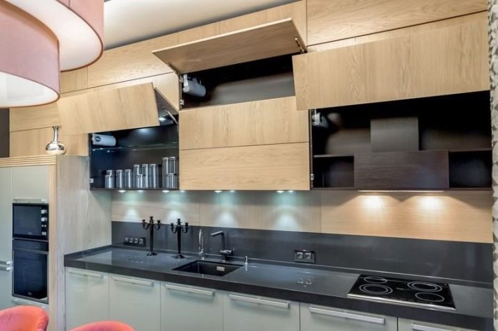 Una importància considerable a l’hora d’escollir la col·locació de mòduls i les seves dimensions és el nivell de sostres a la cuina. Les grans cuines donen l'oportunitat al dissenyador d'organitzar tots els mobles, inclosos els bisagrats, centrats en els conceptes de confort i estètica. Quan la superfície és petita, heu d’ordenar armaris més petits o bé col·locar els estàndards a la mínima alçada de la superfície de treball.