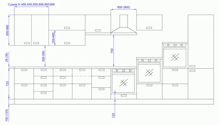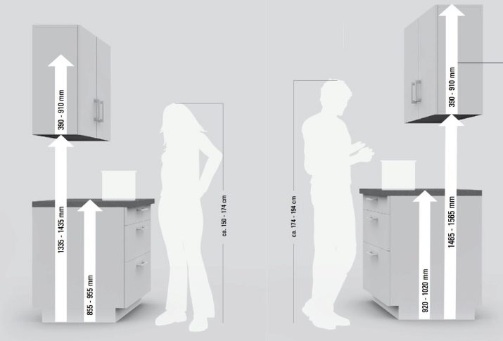 A l’hora de calcular l’alçada de fixació dels mòduls, també es proporciona la ubicació i la finalitat de la instal·lació. Es poden instal·lar no només a sobre del taulell, sinó també en altres zones, per exemple, per sobre d’un capó o d’un refrigerador. Com a resultat d'això És necessari navegar pels estàndards d’armaris de cuina que ofereixen els fabricants.