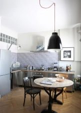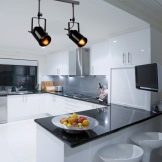- Llums locals. Sovint, no és suficient un enllumenat central, ja que es necessita una il·luminació addicional a sobre de la cuina i a sobre de la taula de treball. Per a aquest propòsit, s’utilitzen làmpades petites. Per exemple, làmpades de llum o làmpades LED, focus, dispositius de paret, es poden col·locar directament damunt del seu lloc de treball: muntades en una paret o en armaris penjats. Una làmpada també pot servir d’aparell d’il·luminació local, no obstant, convé recordar que aquesta làmpada no és adequada per a cuines de mida petita.
