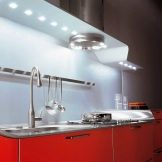 - Projectors destacats. Aquests dispositius d’il·luminació es poden integrar en mobles de cuina, cosa que permet ressaltar totes les superfícies necessàries: prestatgeries en armaris, zona d’aigüera i taulell.