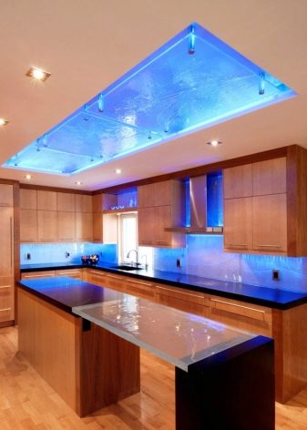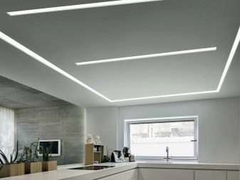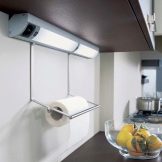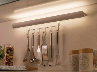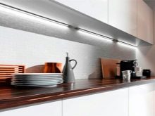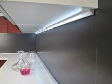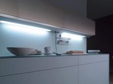 - Tira LED. Aquesta làmpada es pot col·locar al llarg de tota la superfície de treball fixant la cinta als armaris penjants, cosa que garantirà una distribució uniforme de la llum.