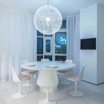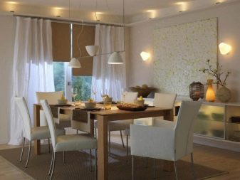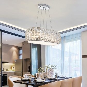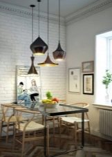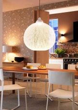 - Diverses làmpades en suspensió llarga. Aquest mètode proporciona una il·luminació completa de la zona de menjador, difonent llum suau.A més, els llums de la suspensió, si es vol, es poden estendre o escurçar afegint o eliminant els enllaços de la cadena.