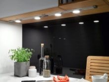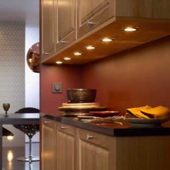 - Taques. Com s'ha esmentat anteriorment, aquest tipus de dispositiu permet dirigir la llum exactament cap a on ho necessiteu. És a dir, només podeu fer un parell d’aparells i dirigir-los a la zona que feu servir. Es poden col·locar tant al rebost dels armaris penjats com a sota d'ells.
