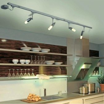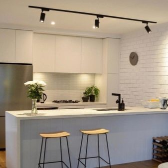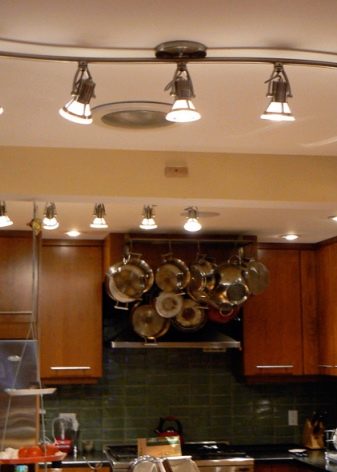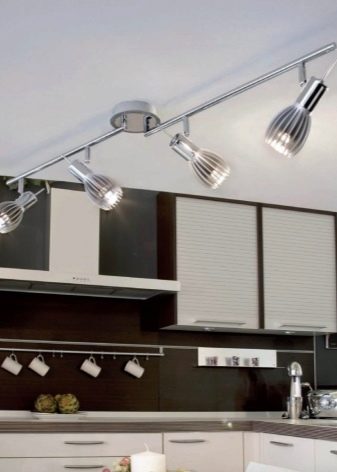 - Busbar Lighting - Es tracta de petites làmpades situades en una carcassa metàl·lica incorporada al sostre. De vegades es poden moure les làmpades al llarg del pneumàtic, cosa que permet ajustar la llum com hauria de ser.