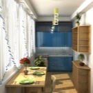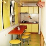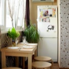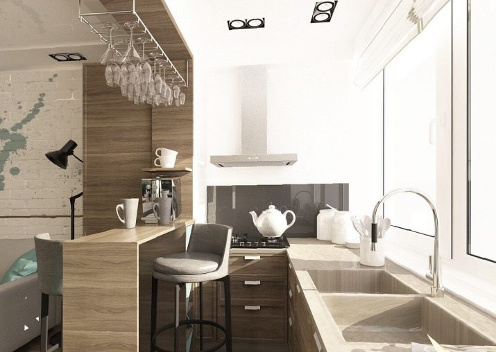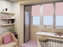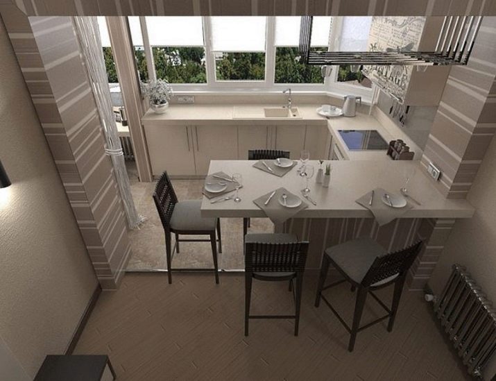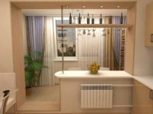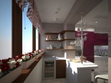 Una bona opció seria combinar una cuina amb una loggia. En aquest disseny, simplement podeu treure la porta i la finestra i, al lloc del parament de la finestra, equipeu una cosa com un taulell de bar, que es pot utilitzar per a un aperitiu lleuger o una petita festa del te.