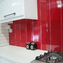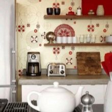 Preferit utilitzar rajoles ceràmiques o guixos decoratius, i posar parquet, linòleum o laminat al terra - és important que els materials utilitzats siguin resistents a la humitat i es netegin bé de taques de greix i substàncies soltes.