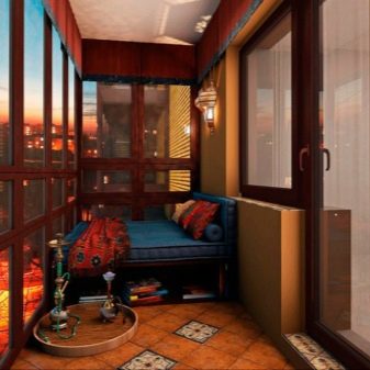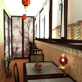 L’espai sembla concis, funcional i sempre elegant. I als amants del color xinès se'ls pot aconsellar pintar les parets en els decorats tradicionals d'aquesta cultura, així com afegir accessoris espectaculars: ventiladors, tiges de bambú i figuretes de porcellana. Per als amants dels exòtics, podeu recomanar Estil africà - en aquest cas, podeu col·locar una pell de lleopard al balcó i posar petites palmeres.