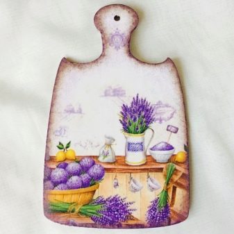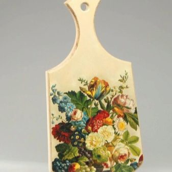 Fixeu-vos en una tècnica com el decoupage. Utilitzeu un costat de la placa de tallar per a la seva finalitat prevista i per decorar el segon. Per al decoupage, heu de comprar pintures acríliques i gouache de qualsevol tipus de colors que us agradi (o potser ja teniu una idea per a què es necessiten colors específics), tovallons de paper amb un patró, cola pva, pinzells, goma d’escuma, paper de lija i vernís per cobrir la superfície després com està tot a punt - per consolidar el resultat.