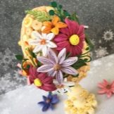 El següent pas és fer caure les fulles entre els pètals de la fila superior. cadena d’escacs. A la primera meitat es eliminaran 3 fileres de flors. Situarem el quart de la mateixa manera, però el diàmetre de les anelles és cada cop més gran, de manera que les manualitats del centre són més amples. Les fulles també es fan més llargues, només es pot doblegar el paper, això en bucle el camí. Obrim l’ou, retirem els botons.
