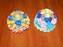 Comencem a colar per la part superior, fixant-nos amb botons o passadors de la confecció, passant pel forat del mig. Apliqueu cola suaument a les juntes dels anells perquè s’enganxin. Enganxeu a sobre i després a baix. Convenient d’utilitzar pinces. Podeu intentar combinar 2-3 colors. Si torceu bobines de diferents mides, obteniu una mena de textura. Es deixa que la cola s’assequi. De cada meitat, traieu amb cura el formulari amb la pel·lícula traient els botons. Les dues parts s’enganxen juntament amb elàstic o fil, fins que la cola s’assequi. Anar a reposar. Franges de 5 mm de gruix, 60 cm de llarg (consta de dues peces 30 + 30). Podeu utilitzar diferents colors. Tordim les bobines, es recullen en forma de flor. Cola sobre una pel·lícula o arxiu. Cola a la base.