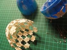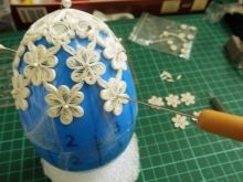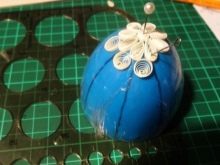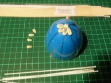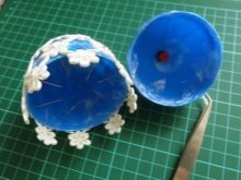 Deixeu que la feina s’assequi durant aproximadament 12 hores, se separen les meitats i, després d'haver tret els pins, traieu una base. Enganxeu un passador a la unió d’1 i 8 lòbuls a les parts superiors i inferiors, de manera que veureu com unir uniformement les meitats. Greixeu les fulles amb cola i pressioneu-les als sins dels pètals. L’ofici s’ha d’assecar bé.