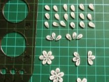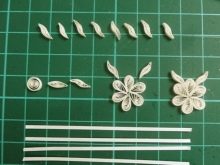 Enrotllem una cinta de paper al llarg de tota la longitud amb un interval de 7 mm - hauria d’obtenir una trena oberta. Aplicar cola i fixar-la al llarg de la vora. A continuació, hi haurà cinc files de 8 cabdells cadascuna. Tordim les cintes de paper de 10 cm amb un rotlle i el formem en forma de gota - 5 mm. Enfilem les fulles de les tires de 7 cm, es debiliten i donem una forma corba. Les flors s’enganxen sobre una superfície llisa. Passats uns minuts, afegim concavitats amb pinces i enganxem la primera fila amb les fulles cap amunt, prement-la amb un passador.