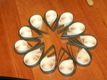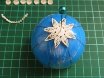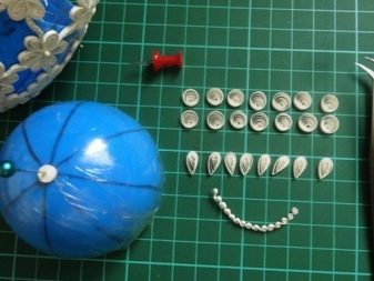Talleu els buits. Necessitarem diferents mides: per a flors grans a la part superior, per acabar la corona (anells i encaixos), per a flors petites. Necessiteu cinta de paper de 4-5 mm de gruix, de 30 cm de llarg. Torquem amb un escuradents o eina. Només 8 peces, apuntades per un costat. Fixem la vora. Posem una bobina al damunt del con, fixant-la amb un passador, enganxem els pètals al damunt i també la clavem. Tingueu en compte que els elements es lubrifiquen acuradament amb cola a les juntes, s’elimina l’excés de cola. A partir de les tires de 15 cm de llarg produirem 8 parts rodones; les enganxem al voltant de l’ornament.