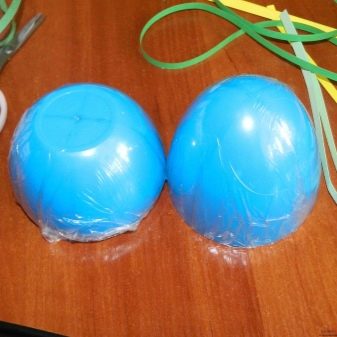 Una classe magistral per fer un ou regular de Pasqua. Es requerirà ou de plàstic de dues meitats. Separa la part superior de la part inferior.Agafeu una pel·lícula o polietilè i emboliqueu cada meitat perquè no quedin bombolles. A continuació, necessitem paper groc brillant rodanxes de 30 cm de llarg per 0,5 d'ample. Agafem un escuradents o un grollet, si un escuradents; dividim la punta, hi posem una cinta de paper i l’enrotllem perquè les bobines s’ajusten perfectament les unes contra les altres. Fixem la punta amb cola. Necessiteu anells tan ajustats 120 peces o una mica més.