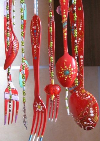 Decora culleres i forquilles amb un sol color, per exemple, vermell. Per dissenyar, utilitzeu una pintura de taques precioses. Revestiu el producte amb vernís i, esperant que s’assequi, fixeu-lo a la línia de pesca / trena. Per fixar-les a les culleres i les forquilles, s’han de fer forats al mànec.