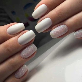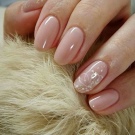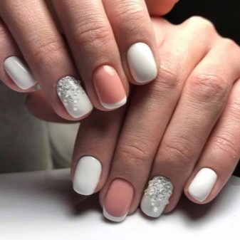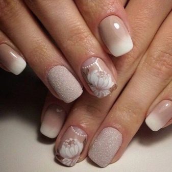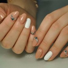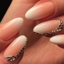 Per decorar una manicura ombre neutra, s’utilitzen strass de tons delicats, que s’apliquen en petites quantitats a cada ungla o es decoren amb l’anell i els dits mitjans. A més de diverses opcions de joieria, podeu jugar a una combinació de vernís blanc i beix de diverses textures. Les superfícies rugoses estan actualment de moda.