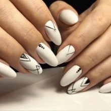 Patrons geomètrics a l'estil del minimalisme, realitzats en forma de petites línies, traços, cercles, perfectament accentuats manicura neta.