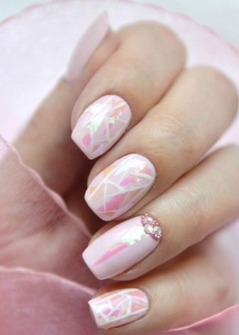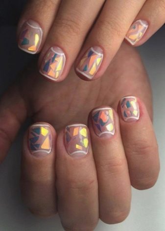 - Vidres trencats. Tot i que estan acostumats a veure-ho amb una manicura més brillant, tindrà un aspecte fantàstic en tons nus. Els seus reflexos es veuran adequats tant a la platja com a la festa del club. La superfície del mirall reflecteix perfectament la incidència lumínica que hi ha.