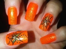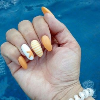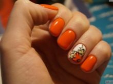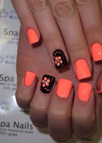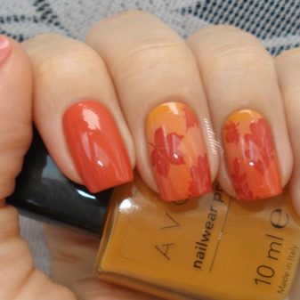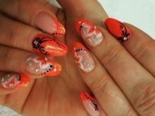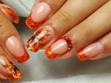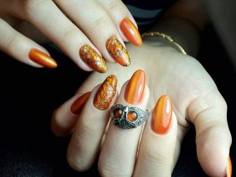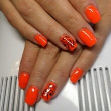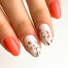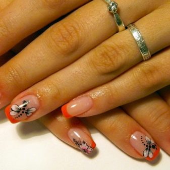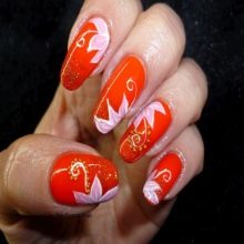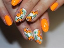 Hi ha opcions que les dones prefereixen més. Quan s’utilitza vernís taronja, s’ofereixen més sovint les flors. La tècnica en aquarel·la del dibuix requereix una certa experiència de la noia, per la qual cosa no sempre és fàcil crear una decoració a les ungles.