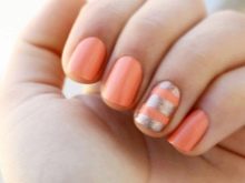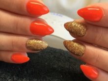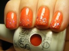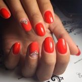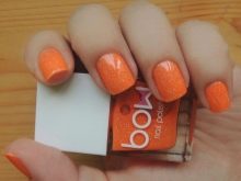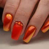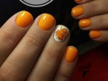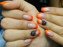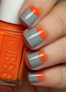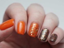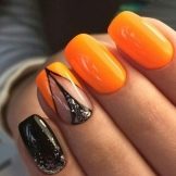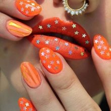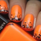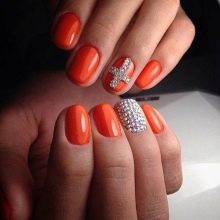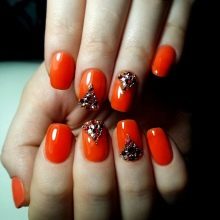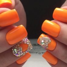 He de dir que el color taronja, fins i tot en monocrom, ja és molt brillant. Però sempre es veu bé en una franja petita de petits cristalls, que poden ser de diversos colors i de color pla. S’ha popularitzat per decorar la cutícula, construir un triangle a partir d’un element decoratiu o utilitzar-les en diferents mides. Si tens un bon gust i una percepció especial, pots crear una composició realment atractiva.