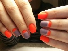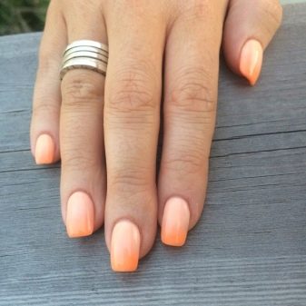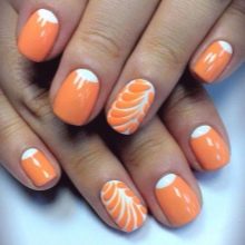 A l’estiu i a la primavera, vull colors vius, de manera que els tons ataronjats semblin adequats. Això també s'aplica a la jaqueta de servei. Podeu fer un disseny molt tranquil i cobrir només la punta de l’ungla sobre una base transparent o dissenyar un disseny de lluna. La tendresa afegirà una petita franja blanca al llarg de la vora. Si voleu una jaqueta degradada, haureu d’utilitzar un aerògraf o una plantilla.