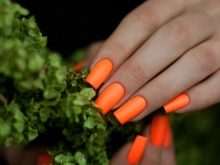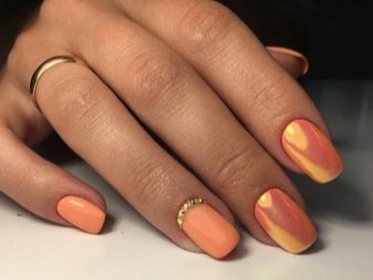 Estaria malament dir que l’ús del gel de taronja de color taronja es limita només a les pedres de pedra o a les fregades. Es pot experimentar amb textura, dibuixos, amb seguretat, per a això només es necessita desig i els materials necessaris. És molt popular combinar una capa mate amb una brillant i perlada. De fet, hi ha moltes opcions, però la manicura monocroma segueix sent clàssica.
