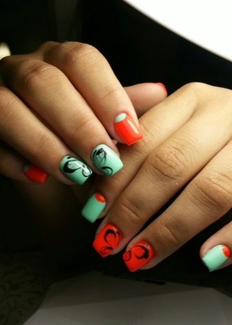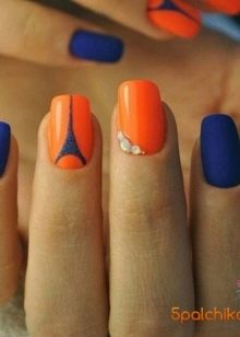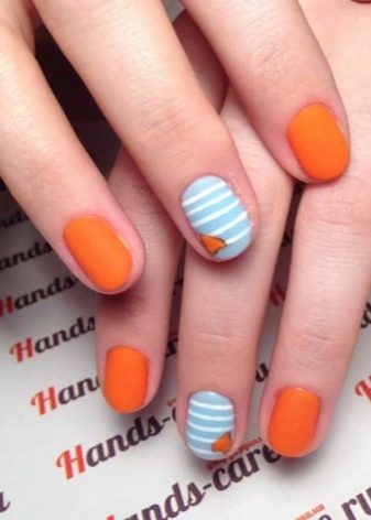 Independentment de la longitud de les ungles, cal seleccionar amb cura el "company de disseny" per al color taronja. Si es tracta d’ungles petites, és millor donar preferència al blau. A més, el color no hauria de ser massa brillant, sinó silenciar.