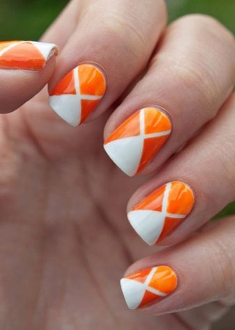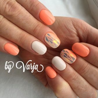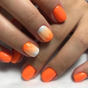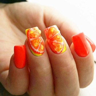Si voleu alguna cosa més vibrant i contrastada, haureu de parar atenció al xavic de taronja i a una imatge en forma de rodanxa de taronja. Hauria de ser voluminós, perquè només llavors la manicura resultarà insòlita. En el passat i enguany, aquest disseny està en el punt àlgid de la popularitat.