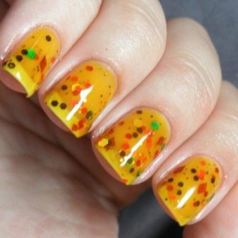 Tot i que el taronja ocupa una posició intermèdia entre els colors principals groc i vermell de la paleta de colors, hi ha moltes opcions populars per a la seva execució. Entre ells es pot anomenar tons ambre i mel, i les dones més atrevides utilitzen sovint colors de pell de pastanaga o guineu. El color de la posta de sol i rovellós sembla molt brillant en el disseny de les ungles.