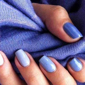 La tonalitat blava es combina perfectament amb altres colors. Es recomana aplicar un to més fosc sobre les ungles curtes, ja que es veu millor. Tots els tons de blau i blau són adequats, es poden pintar sols o combinar-se entre ells. Una excel·lent opció són els colors blanc, beix i lletós, que donaran a la imatge una tendresa i s’ajusten al to dels accessoris. Un vestit blau pàl·lid sovint es complementa amb tons pastel de rosa, menta, lila o canari.