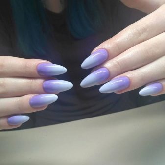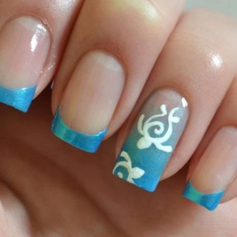 - Ombre. Aquesta manicura és molt popular i es veurà harmònicament en les ungles de qualsevol llargada. A la primera capa s'ha d'aplicar una base transparent, de manera que el patró quedés uniforme. A continuació, es pinta un petit tros de l’esponja amb els colors desitjats i s’aplica a l’ungla. Es transferirà el disseny desitjat en si, l’ombre també té un aspecte diferent, la peculiaritat del qual és el pas d’un color més fosc a un de clar no en una ungla, sinó en altres. Per exemple, el dit petit està pintat en un blau profund, el sense nom en un to més clar, el mig en blau, l’índex en blau flor de blat de moro i el gran en blanc. Així, es crea un efecte de transició que té un aspecte excel·lent amb qualsevol vestit, segons el color escollit.