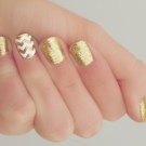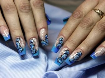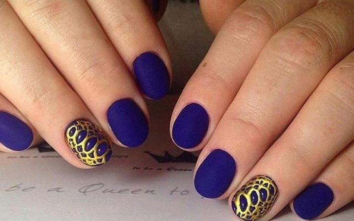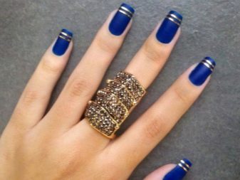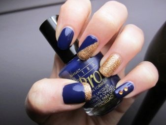 Si la dama va decidir comprar un vestit blau per al casament, pot fer una manicura original que no estigui sense elegància i gràcia. Si l’element té un accessori d’or (per exemple, un cinturó), podeu fer servir espurnes daurades. El adhesiu del vernís blau i d'or és el que permetrà que la imatge sigui més profunda. A més, la noia utilitzarà un disseny que utilitzi poliment d'or. Per fer-ho, complementeu-ho amb cintes blaves, adhesius.