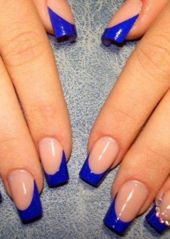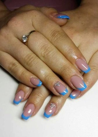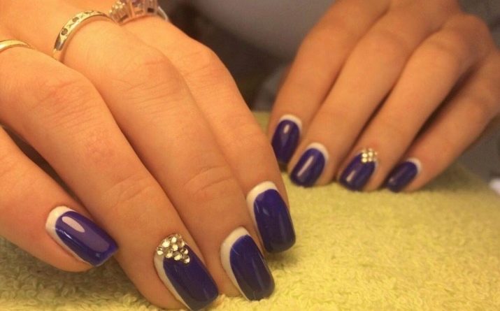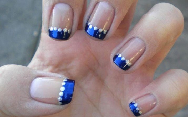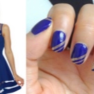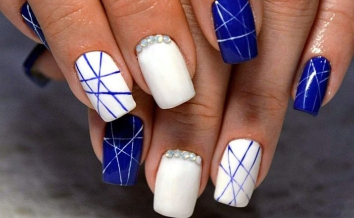 Els propietaris d’ungles curtes durant molt de temps trien una manicura adequada. Sota un vestit blau, una bona opció seria utilitzar un patró geomètric capaç d’allargar visualment l’ungla. És millor pintar les plaques de les ungles amb una base clara (blanca), i després aplicar un patró blau. Això permetrà que la imatge sigui femenina i elegant.