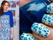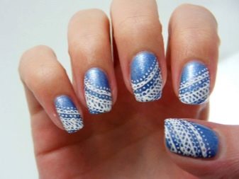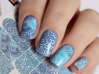 Els vestits blaus amb una inserció de puntes permeten a la noia posar-li un model de cordó a les ungles. Un segell especial sobre el qual cal aplicar vernís blanc l’ajudarà en això. A continuació, heu d’adjuntar-li un rètol de goma i, a continuació, transferir la imatge amb el signet a l’ungla. El fons del cordó és blau.