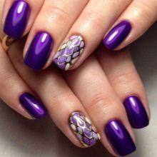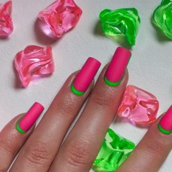 Per exemple, una bona opció és una jaqueta tranquil·la, en la qual s’utilitza l’efecte metàl·lic al vostre abast. Una altra idea original és una manicura de lluna, en la qual hi ha un color de neó brillant al forat.