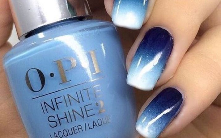 Podeu utilitzar una altra versió d’aquest disseny. Per fer-ho, pinteu la vora de l’ungla amb una tonalitat blava en lloc de blanca. Això és extremadament apropiat per a un vestit blau. L’ombra del vernís no ha de ser el mateix que el color del vestit, podeu triar un to més clar o més fosc. Una excel·lent opció és una tonalitat blava pàl·lida que sembla increïblement clara i aèria.