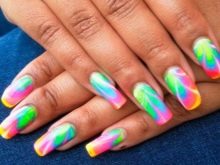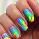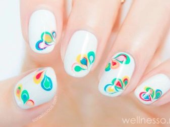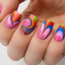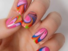Aquest és un altre aspecte no estàndard i interessant. Per crear una manicura amb un disseny així, heu de gotejar unes gotes de vernís de diferents colors en aigua i remenar-les amb un escuradents.Després d’això, la base completament processada i recoberta s’immersa en aigua i s’asseca. Al final, s’aplica una part superior i es torna a assecar l’ungla.