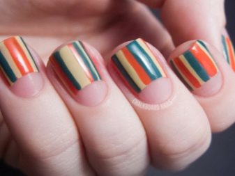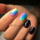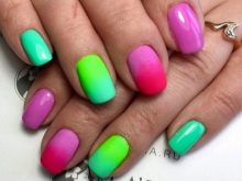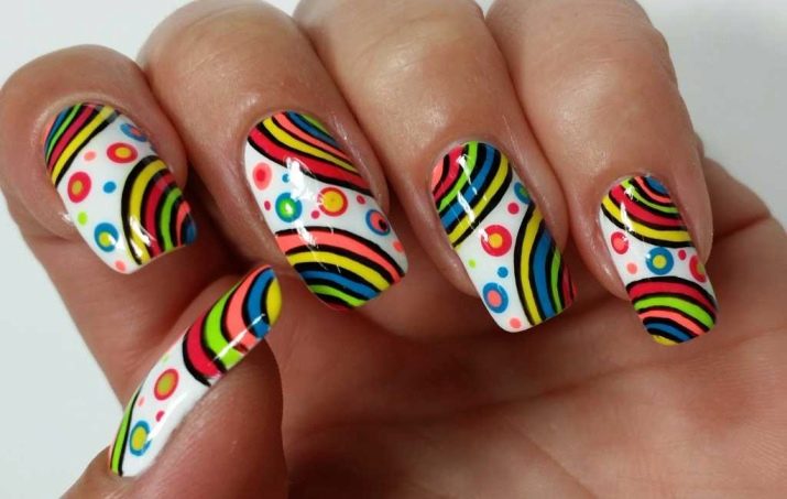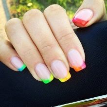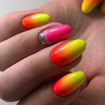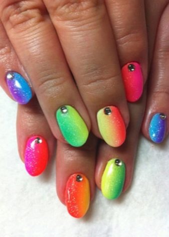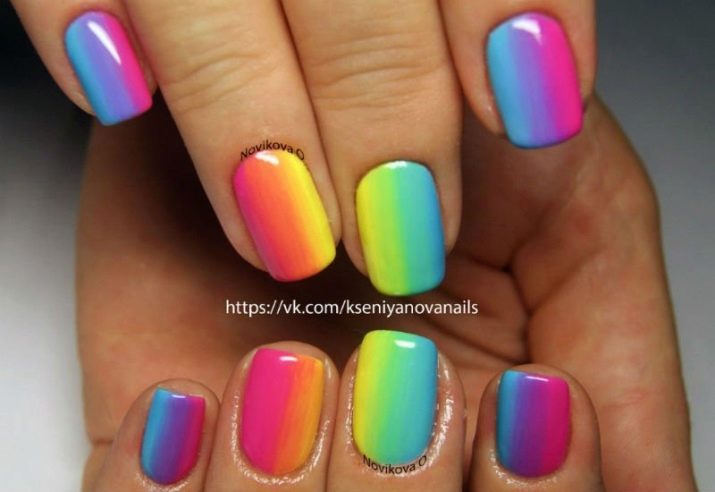 La manicura arc de Sant Martí és molt inusual, ja que no es limita a set colors. Podeu utilitzar qualsevol tonalitat. L’únic que no és gaire benvingut és l’ús actiu del negre, ja que ultrapassa la imatge general, però, es pot utilitzar el negre per a petites insercions i inclusions.