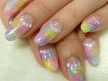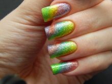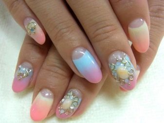 La manicura de l’arc de Sant Martí en la majoria dels casos és brillant i pegadissa, però, pot ser que alguns no siguin suficients, per tant, a més de la manicura, podeu utilitzar espurnes i strass, donaran una aura especial i distingeixen immediatament l’amo d’aquest tipus d’ungles de la multitud.