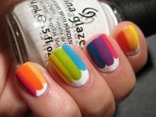La jaqueta o la manicura arc de Sant Martí amb cinta adhesiva de l'arc de Sant Martí és un autèntic èxit de la temporada. La tècnica no és diferent de crear una jaqueta habitual. En alguns casos, la cinta adhesiva es pot enganxar a tota la placa de les ungles.