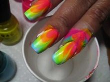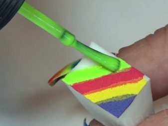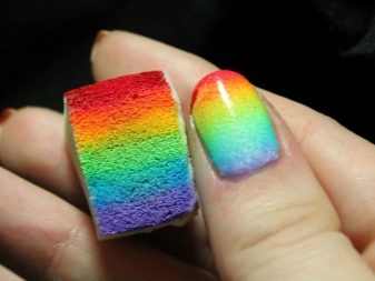 - A continuació, cal agafar una esponja regular i tallar-la a trossos petits, una mica més que l’ungla en si. A cada peça aplicem vernís de diferents colors, es permeten dos colors per segment. Els colors s'apliquen en qualsevol combinació, tot depèn del vostre desig. Si no hi ha temps per pensar, simplement podeu decorar les ungles amb tots els colors de l’arc de Sant Martí.