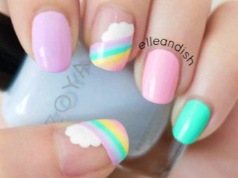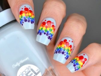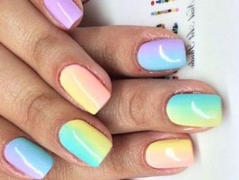 La manicura arc de Sant Martí es divideix en moltes subespècies i dóna una llibertat d’acció gairebé completa a l’artista, perquè tothom pot dibuixar tot el que li agradi. A més, qualsevol mena és peculiar i encaixa diferents imatges. Independentment dels vostres gustos, podeu trobar fàcilment el tipus adequat de disseny de l’arc de Sant Martí i complementarà perfectament el vostre estil i imatge.