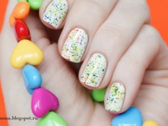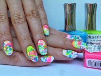 L’essència d’aquest disseny és crear una mena de taques de colors sobre un fons blanc. El procés pràcticament no és diferent de les opcions anteriors, tret de l'aplicació del color. Es creen esquitxades de color sobre fons blanc amb l'ajut d'un tub al qual cal escórrer una mica de vernís de colors. Després de cada to, es pot eixugar el tub per netejar els colors o, per contra, per crear un aerosol mixt. A més del vernís blanc, aquí s’utilitzen generalment 3-4 colors diferents, inclòs el negre, però només en combinació amb altres colors vius.