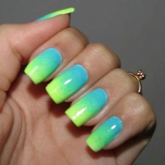 A més de la clàssica manicura arc de Sant Martí, podeu combinar dos colors a cada ungla, per això és important triar tons que es complementin. S’apliquen des del polze fins al dit petit. Pot ser vermell i groc-taronja, taronja i groc-verd, groc i verd-blau, verd i blau-violeta, blau i violeta. La segona mà hauria de tenir la mateixa combinació.