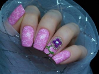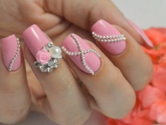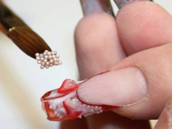 Per aplicar dibuixos complexos, és millor visitar un saló d’ungles i veure l’assistent.A casa, heu de començar per patrons senzills o amb un revestiment monofònic amb brous petits i, quan adquireixis les habilitats necessàries, podeu començar a dissenyar composicions més complexes, mentre que és recomanable utilitzar no més de 3-4 colors de perles.