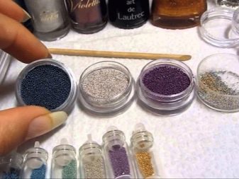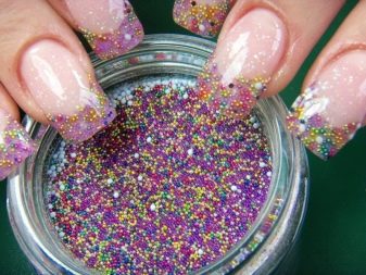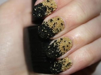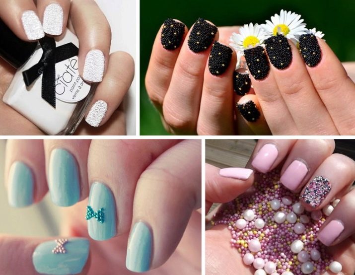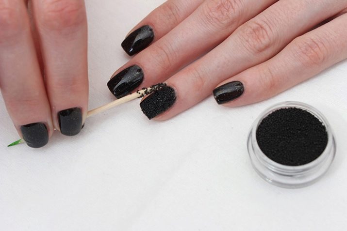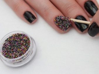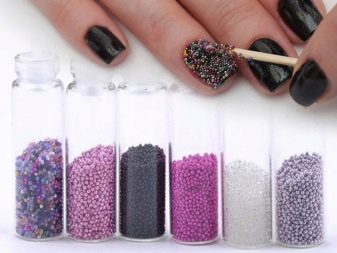 La manicura de caviar implica l’ús del vernís tonal i, amb la seva combinació harmònica amb els caldos, s’obté una composició bonica i acabada. Pot ser perles de diferents colors o brous simples. Cal recordar que, com més grans són els productes, amb més cura s’adhereixen a les plaques de les ungles. Per tant, per a aquest tipus de manicura necessitaràs un fixador o cola especial incolora.La segona opció és preferible, perquè la part exterior de les perles segueix sense ser tocada i tenen un aspecte molt elegant i elegant.
