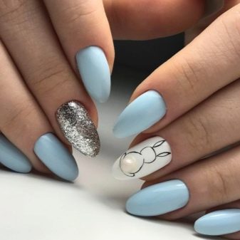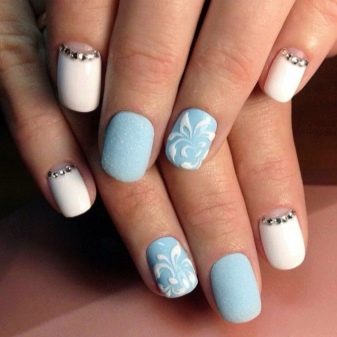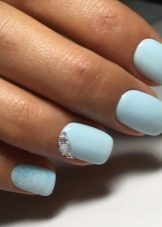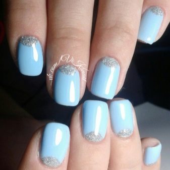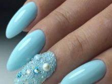Pel que fa a les guspires, darrerament estan de moda lluentons de diverses mides i formes, es consideren la decoració principal de la manicura blava. Els elements platejats brillants posen en relleu el to delicat del recobriment.No menys interessants són les composicions amb brillants d'or i rosa. Es poden enrotllar amb un clau en forma de patró i ratlles.