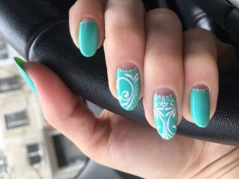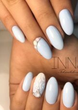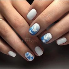 Una combinació de color aeri amb blanc és una opció guanyadora. Aquest "clau d'ungles" és universal, ja que es pot utilitzar en qualsevol moment de l'any. Al mateix temps, les imatges d’animals i flocs de neu han de prevaler en la decoració a la primavera, els dibuixos en forma d’ocells, plomes i ornaments d’encaix han de prevaler a la primavera, mentre que a l’estiu es recomana decorar les ungles amb un tema marí, donant preferència a les composicions en forma d’habitants de mar, ancoratges i vaixells.